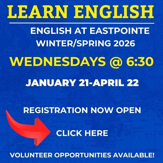 Eastpointe Christian Church would like to welcome you to English at Eastpointe. We provide English instruction for levels ranging from beginner non-English speakers to advanced English speakers. Learners are practicing English skills in reading, writing, speaking, and listening while working on vocabulary skills through engaging activities, modeling, and interactions with native English speakers. Instruction is provided by Eastpointe Volunteers. STUDENTS MAY JOIN THE CLASS ON ANY WEDNESDAY EVENING DURING THE YEAR.